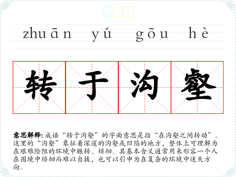 成语“转于沟壑”的字面意思是指“在沟壑之间转动”。这里的“沟壑”象征着深邃的沟壑或凹陷的地方,整体上可理解为在艰难险阻的环境中辗转、徘徊。其基本含义通常用来形容一个人在困境中徘徊而难以自拔,也可以引申为在复杂的环境中迷失方向。