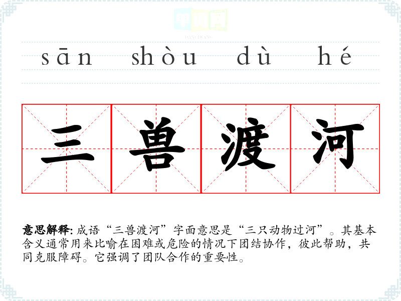 成语“三兽渡河”字面意思是“三只动物过河”。其基本含义通常用来比喻在困难或危险的情况下团结协作,彼此帮助,共同克服障碍。它强调了团队合作的重要性。