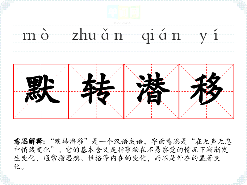 “默转潜移”是一个汉语成语,字面意思是“在无声无息中悄然变化”。它的基本含义是指事物在不易察觉的情况下渐渐发生变化,通常指思想、性格等内在的变化,而不是外在的显著变化。