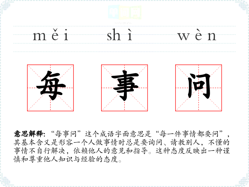 “每事问”这个成语字面意思是“每一件事情都要问”,其基本含义是形容一个人做事情时总是要询问、请教别人,不懂的事情不自行解决,依赖他人的意见和指导。这种态度反映出一种谨慎和尊重他人知识与经验的态度。