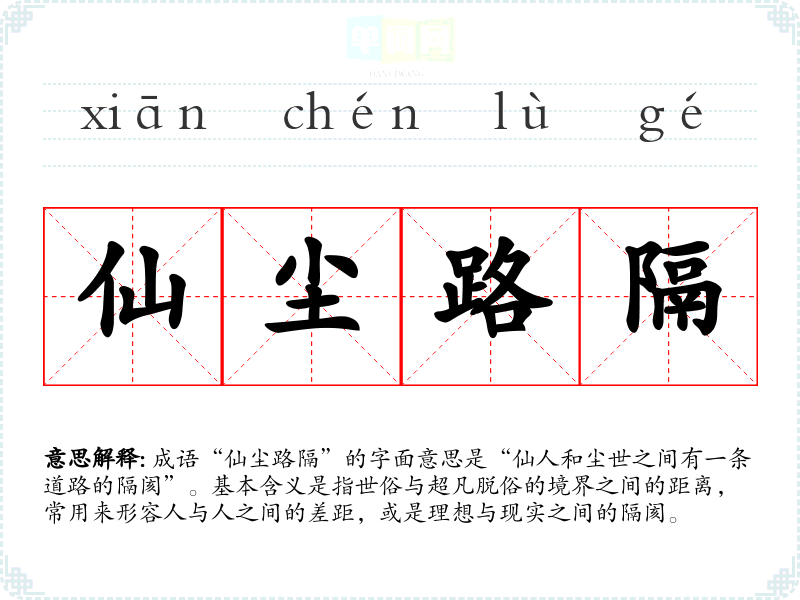 成语“仙尘路隔”的字面意思是“仙人和尘世之间有一条道路的隔阂”。基本含义是指世俗与超凡脱俗的境界之间的距离,常用来形容人与人之间的差距,或是理想与现实之间的隔阂。