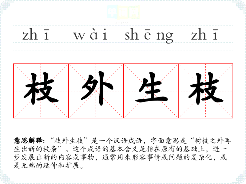“枝外生枝”是一个汉语成语,字面意思是“树枝之外再生出新的枝条”。这个成语的基本含义是指在原有的基础上,进一步发展出新的内容或事物,通常用来形容事情或问题的复杂化,或是无端的延伸和扩展。