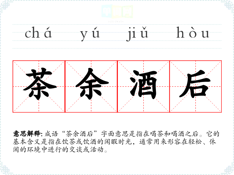 成语“茶余酒后”字面意思是指在喝茶和喝酒之后。它的基本含义是指在饮茶或饮酒的闲暇时光,通常用来形容在轻松、休闲的环境中进行的交谈或活动。