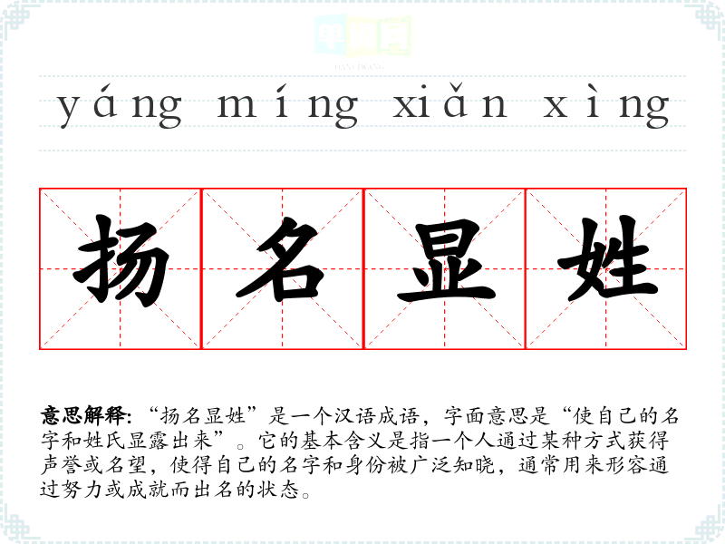 “扬名显姓”源于古代**对个人身份和名声的重视。在古代,特别是士人阶层,姓名的显赫与否直接影响个人的社会地位和声望。这个成语可以追溯到古代文学作品中,强调了个人成就与声誉之间的关系。