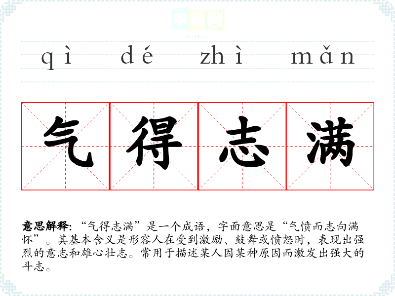 该成语的具体来源并不十分明确,但可以推测其形成与古代文人对情感与志向的重视、以及对激励与奋发向上的赞美有关。许多古代文学作品中常提到因愤怒或激励而奋发向上的情景,因此“气得志满”可能是在这种文化背景下逐渐演变而来的。