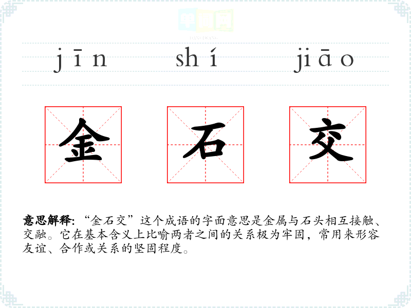 “金石交”这个成语的字面意思是金属与石头相互接触、交融。它在基本含义上比喻两者之间的关系极为牢固,常用来形容友谊、合作或关系的坚固程度。