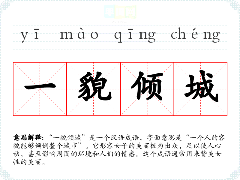 “一貌倾城”是一个汉语成语,字面意思是“一个人的容貌能够倾倒整个城市”。它形容女子的美丽极为出众,足以使人心动,甚至影响周围的环境和人们的情感。这个成语通常用来赞美女性的美丽。