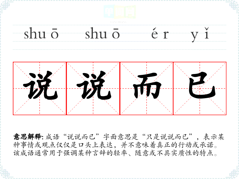成语“说说而已”字面意思是“只是说说而已”,表示某种事情或观点仅仅是口头上表达,并不意味着真正的行动或承诺。该成语通常用于强调某种言辞的轻率、随意或不具实质性的特点。