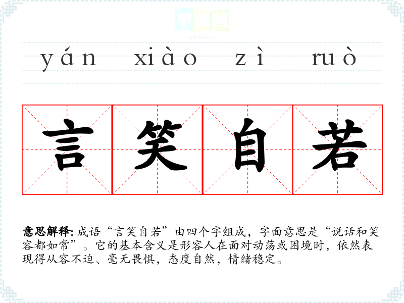 成语“言笑自若”由四个字组成,字面意思是“说话和笑容都如常”。它的基本含义是形容人在面对动荡或困境时,依然表现得从容不迫、毫无畏惧,态度自然,情绪稳定。