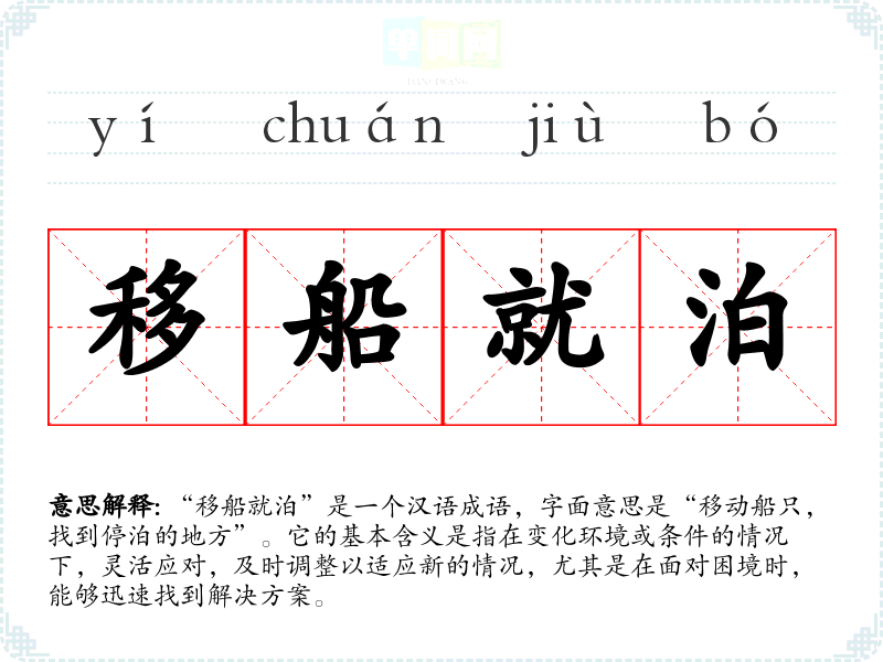 “移船就泊”是一个汉语成语,字面意思是“移动船只,找到停泊的地方”。它的基本含义是指在变化环境或条件的情况下,灵活应对,及时调整以适应新的情况,尤其是在面对困境时,能够迅速找到解决方案。