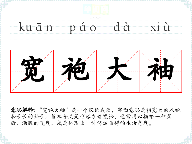 “宽袍大袖”是一个汉语成语,字面意思是指宽大的衣袍和长长的袖子。基本含义是形容衣着宽松,通常用以描绘一种潇洒、洒脱的气度,或是体现出一种悠然自得的生活态度。