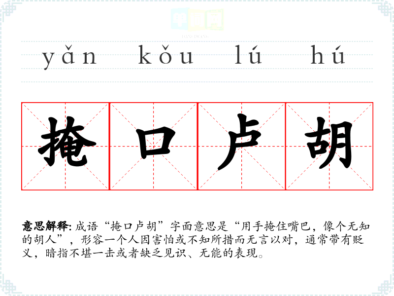 成语“掩口卢胡”字面意思是“用手掩住嘴巴,像个无知的胡人”,形容一个人因害怕或不知所措而无言以对,通常带有贬义,暗指不堪一击或者缺乏见识、无能的表现。