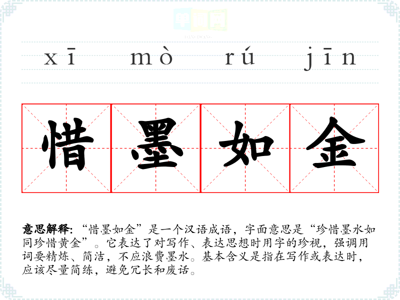 “惜墨如金”是一个汉语成语,字面意思是“珍惜墨水如同珍惜黄金”。它表达了对写作、表达思想时用字的珍视,强调用词要精炼、简洁,不应浪费墨水。基本含义是指在写作或表达时,应该尽量简练,避免冗长和废话。