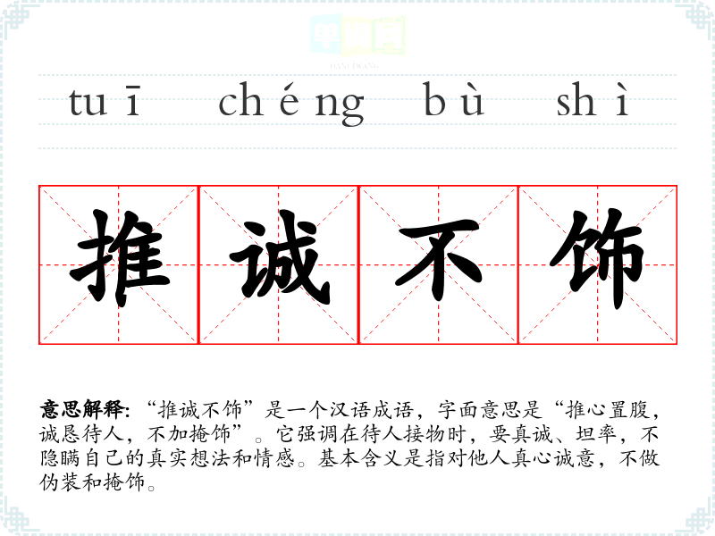 | 推诚不饰 | 推诚相见,毫不掩饰自己。比喻对人诚实,毫无虚假之意。 |