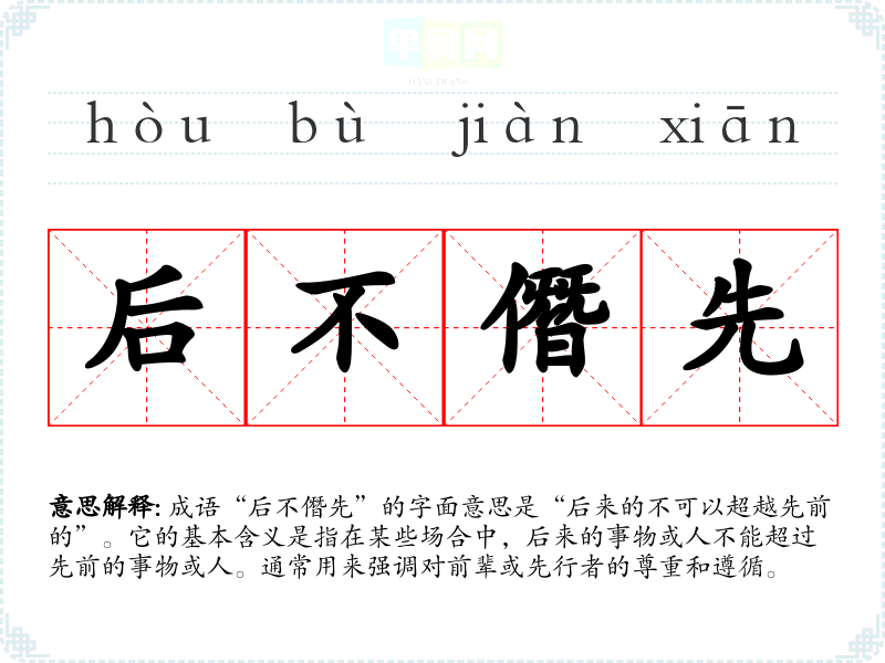 成语“后不僭先”的字面意思是“后来的不可以超越先前的”。它的基本含义是指在某些场合中,后来的事物或人不能超过先前的事物或人。通常用来强调对前辈或先行者的尊重和遵循。