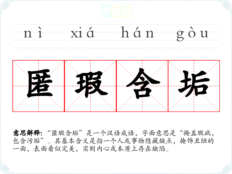 “匿瑕含垢”是一个汉语成语,字面意思是“掩盖瑕疵,包含污垢”。其基本含义是指一个人或事物隐藏缺点,掩饰丑陋的一面,表面看似完美,实则内心或本质上存在缺陷。
