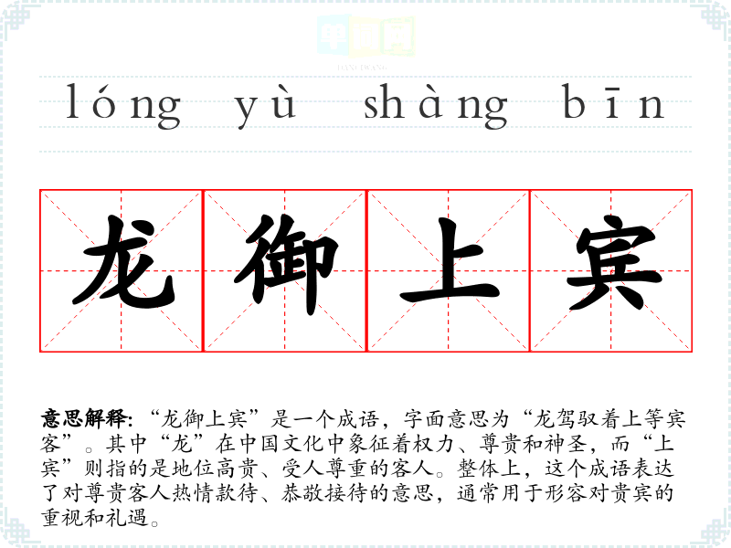 “龙御上宾”让我联想到一种受欢迎和被重视的感觉,仿佛在某个重要的场合中,自己也成为了被尊敬的对象。这个成语在表达敬意的同时,也传递出一种温暖和亲切的情感。