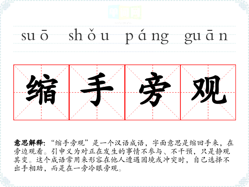 | 缩手旁观 | 把手缩在袖子里,在一旁观看。比喻置身事外,既不过问,也不协助别人。 |