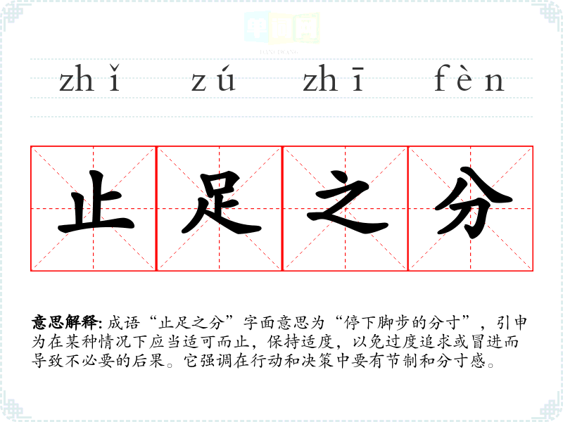 - 日常对话:如朋友之间讨论工作与生活的平衡时,可以引用“止足之分”来提醒对方不要过度追求工作成就。