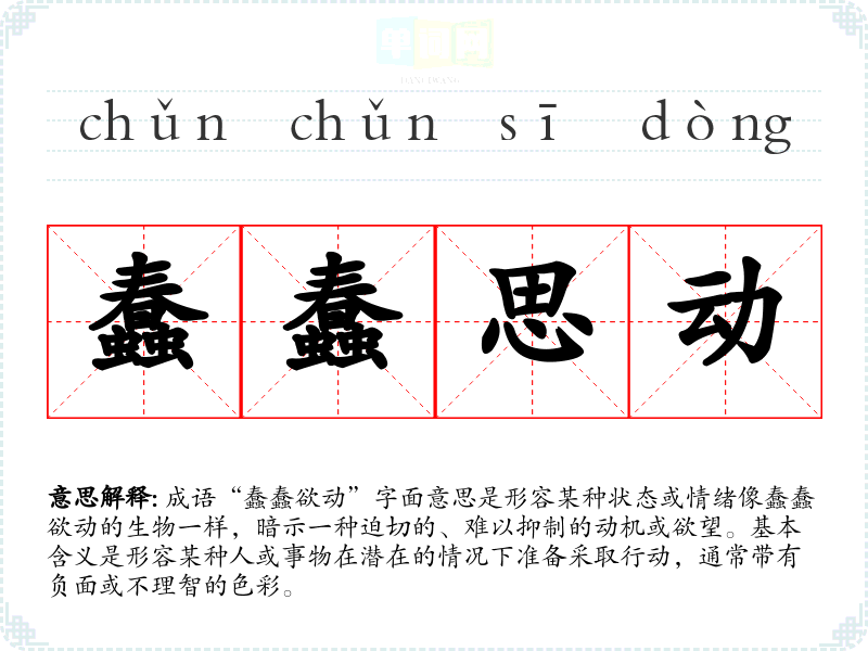 成语“蠢蠢欲动”字面意思是形容某种状态或情绪像蠢蠢欲动的生物一样,暗示一种迫切的、难以抑制的动机或欲望。基本含义是形容某种人或事物在潜在的情况下准备采取行动,通常带有负面或不理智的色彩。