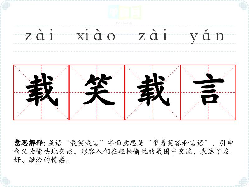 成语“载笑载言”字面意思是“带着笑容和言语”,引申含义为愉快地交谈,形容人们在轻松愉悦的氛围中交流,表达了友好、融洽的情感。