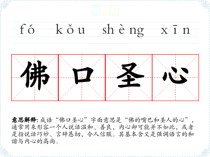 成语“佛口圣心”字面意思是“佛的嘴巴和圣人的心”,通常用来形容一个人说话温和、善良,内心却可能并不如此,或者是指说话巧妙、言辞恳切,令人信服。其基本含义是强调语言的和谐与内心的高尚。