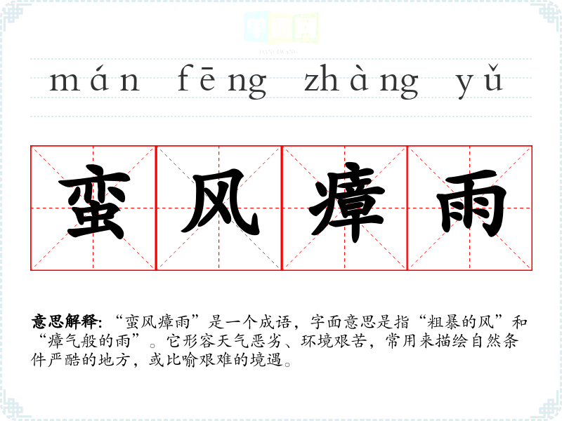 - 演讲:用来比喻社会或经济环境的不利条件,如“在蛮风瘴雨的经济环境中,我们要保持冷静。”