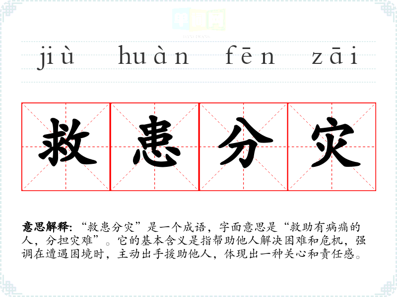 “救患分灾”是一个成语,字面意思是“救助有病痛的人,分担灾难”。它的基本含义是指帮助他人解决困难和危机,强调在遭遇困境时,主动出手援助他人,体现出一种关心和责任感。