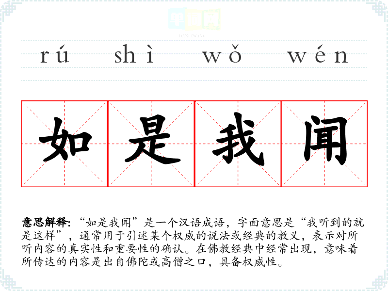 “如是我闻”是一个汉语成语,字面意思是“我听到的就是这样”,通常用于引述某个权威的说法或经典的教义,表示对所听内容的真实性和重要性的确认。在**经典中经常出现,意味着所传达的内容是出自佛陀或高僧之口,具备权威性。