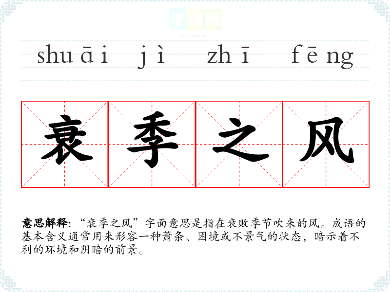 “衰季之风”并不是一个广为人知的成语,历史背景和具体出处较为模糊。可以推测其来源可能与古代文人对自然界变化的观察有关,尤其是将季节的变化与社会、人事的兴衰联系在一起。古典文学中常常通过自然景象反映人类社会的变化。