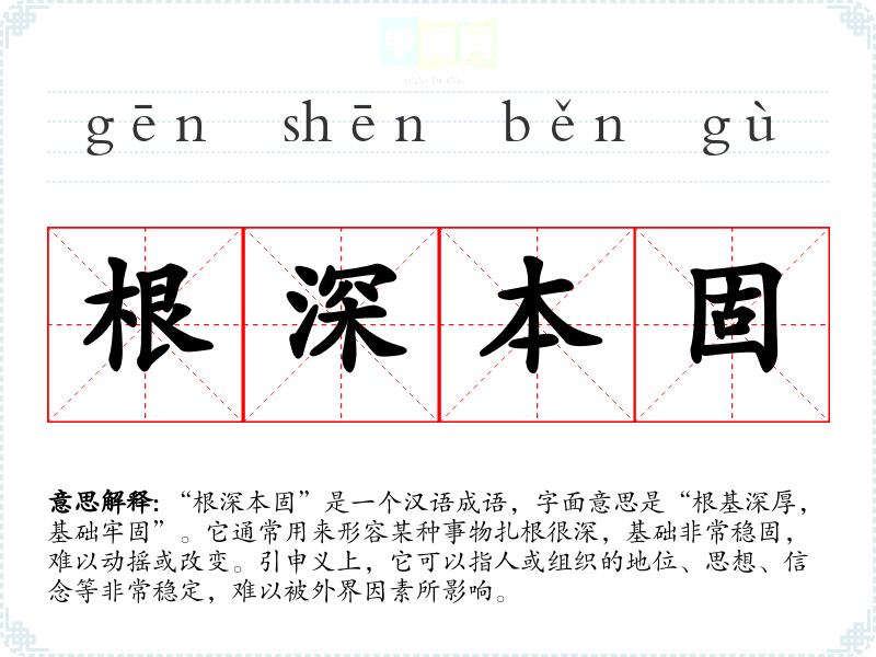 “根深本固”是一个汉语成语,字面意思是“根基深厚,基础牢固”。它通常用来形容某种事物扎根很深,基础非常稳固,难以动摇或改变。引申义上,它可以指人或组织的地位、思想、信念等非常稳定,难以被外界因素所影响。