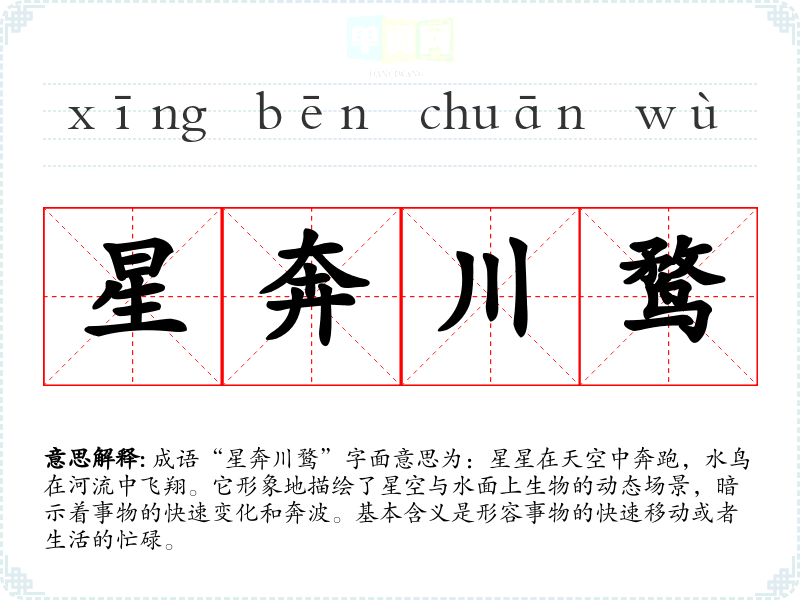 成语“星奔川鹜”字面意思为:星星在天空中奔跑,水鸟在河流中飞翔。它形象地描绘了星空与水面上生物的动态场景,暗示着事物的快速变化和奔波。基本含义是形容事物的快速移动或者生活的忙碌。