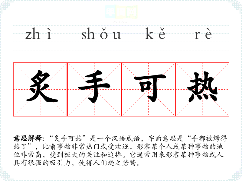 “炙手可热”是一个汉语成语,字面意思是“手都被烤得热了”,比喻事物非常热门或受欢迎,形容某个人或某种事物的地位非常高,受到极大的关注和追捧。它通常用来形容某种事物或人具有很强的吸引力,使得人们趋之若鹜。
