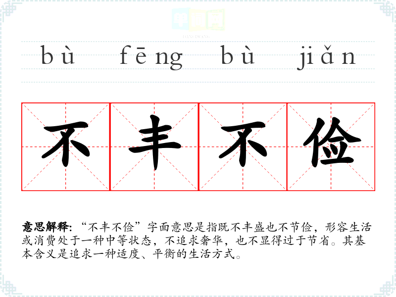 “不丰不俭”字面意思是指既不丰盛也不节俭,形容生活或消费处于一种中等状态,不追求奢华,也不显得过于节省。其基本含义是追求一种适度、平衡的生活方式。