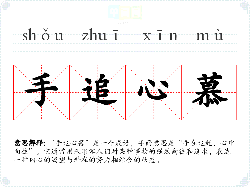 “手追心慕”的确切来源并不详尽,但可以推测它可能源于古代文人对感情与努力的描写,尤其是在表达对某种理想或目标的追求时。类似的成语在古文学中常常出现在描写爱情或志向的诗句中,体现出人们对美好事物的执着追求。