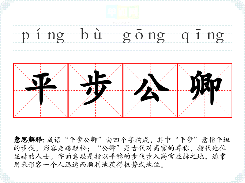 成语“平步公卿”由四个字构成,其中“平步”意指平坦的步伐,形容走路轻松;“公卿”是古代对高官的尊称,指代地位显赫的人士。字面意思是指以平稳的步伐步入高官显赫之地,通常用来形容一个人迅速而顺利地获得权势或地位。