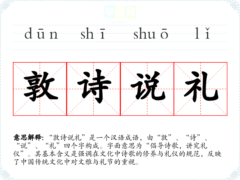 | 敦诗说礼 | 敦:敦厚。诗:《诗经》。诚恳地学《诗》,大力讲《礼》。旧时统治阶级表示要按照《诗经》温柔敦厚的精神和古礼的规定办事。 |