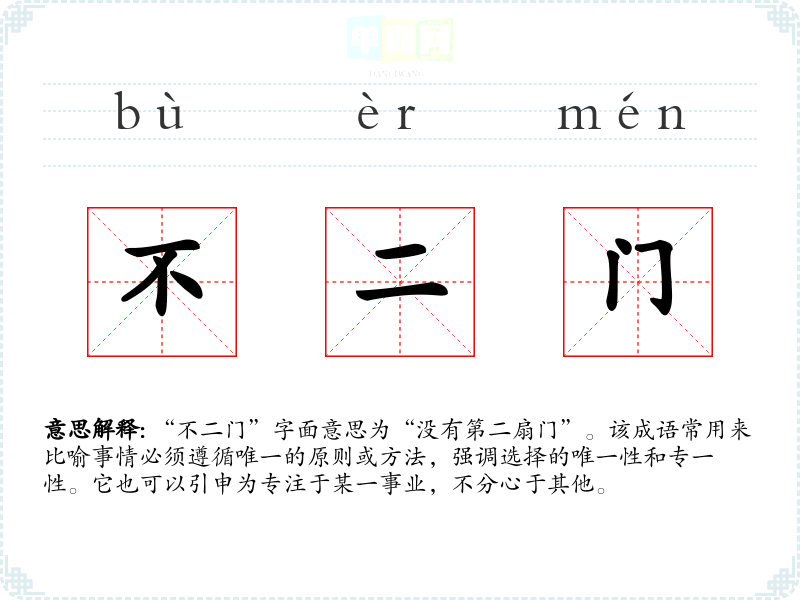 “不二门”字面意思为“没有第二扇门”。该成语常用来比喻事情必须遵循唯一的原则或方法,强调选择的唯一性和专一性。它也可以引申为专注于某一事业,不分心于其他。