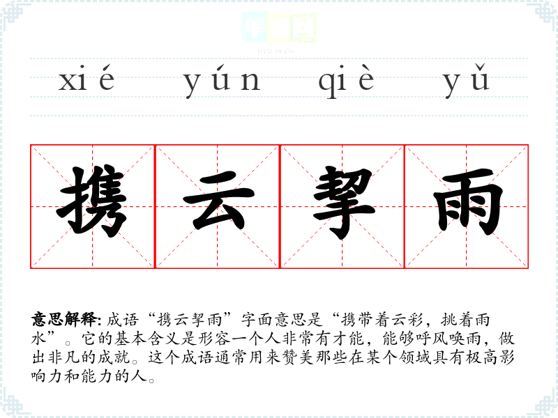 成语“携云挈雨”字面意思是“携带着云彩,挑着雨水”。它的基本含义是形容一个人非常有才能,能够呼风唤雨,做出非凡的成就。这个成语通常用来赞美那些在某个领域具有极高影响力和能力的人。