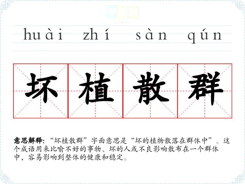 “坏植散群”字面意思是“坏的植物散落在群体中”。这个成语用来比喻不好的事物、坏的人或不良影响散布在一个群体中,容易影响到整体的健康和稳定。