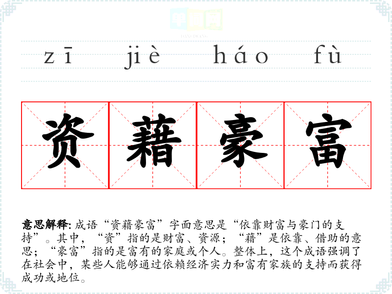 成语“资藉豪富”字面意思是“依靠财富与豪门的支持”。其中,“资”指的是财富、资源;“藉”是依靠、借助的意思;“豪富”指的是富有的家庭或个人。整体上,这个成语强调了在社会中,某些人能够通过依赖经济实力和富有家族的支持而获得成功或地位。