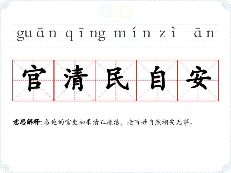 | 一清如水 | 清·清澈。像流水一样清澈。形容为官廉洁,不贪污、不受贿。也形容十分清洁。 |