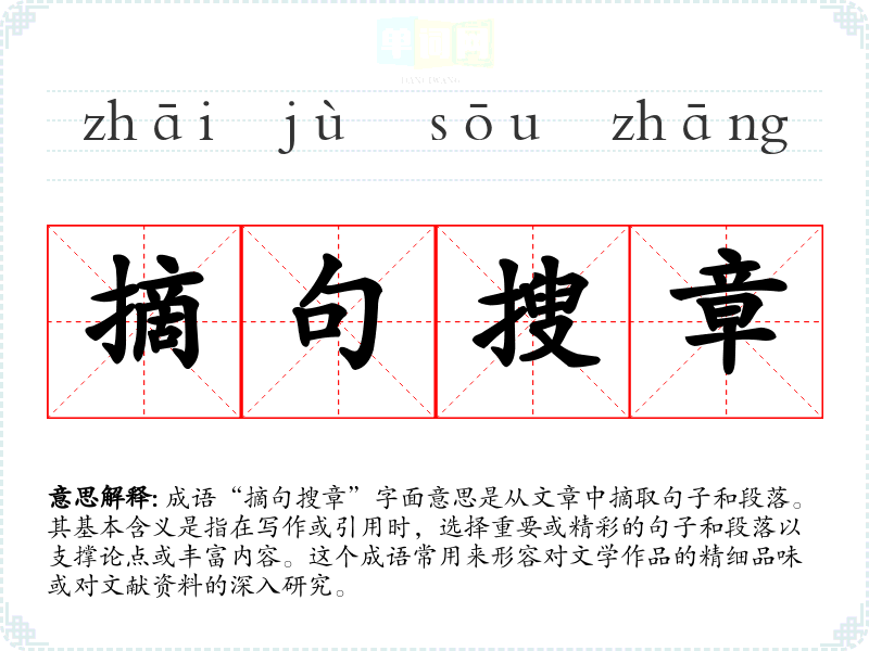 成语“摘句搜章”字面意思是从文章中摘取句子和段落。其基本含义是指在写作或引用时,选择重要或精彩的句子和段落以支撑论点或丰富内容。这个成语常用来形容对文学作品的精细品味或对文献资料的深入研究。