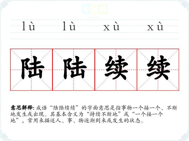 成语“陆陆续续”的字面意思是指事物一个接一个、不断地发生或出现。其基本含义为“持续不断地”或“一个接一个地”,常用来描述人、事、物逐渐到来或发生的状态。