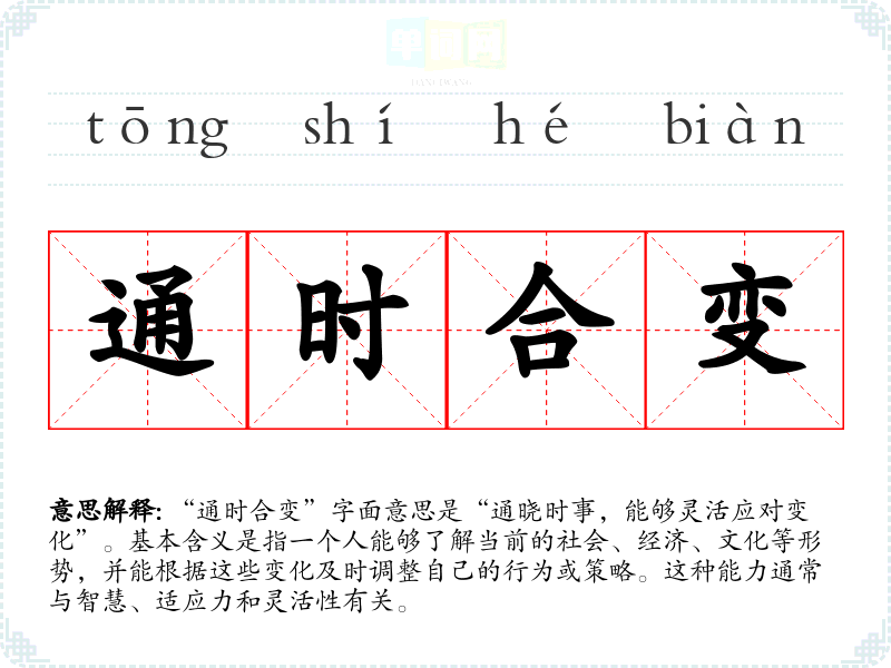 “通时合变”字面意思是“通晓时事,能够灵活应对变化”。基本含义是指一个人能够了解当前的社会、经济、文化等形势,并能根据这些变化及时调整自己的行为或策略。这种能力通常与智慧、适应力和灵活性有关。