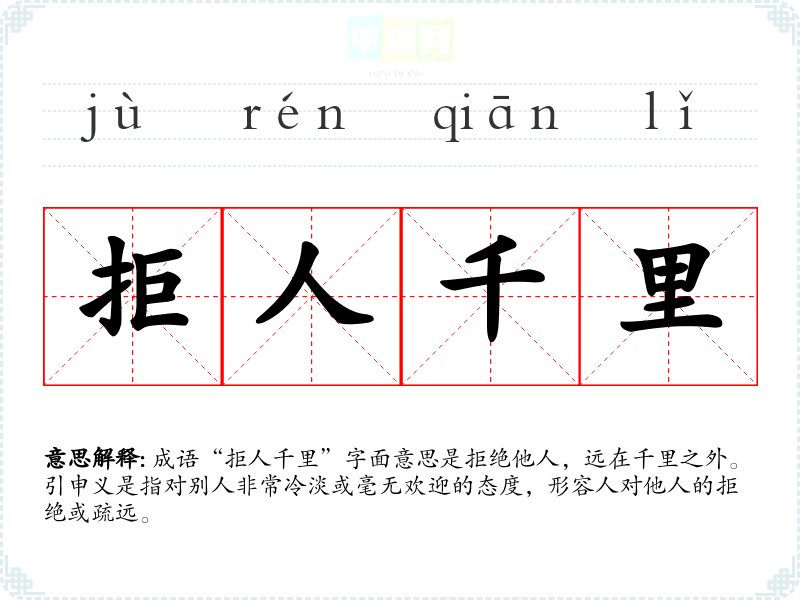 成语“拒人千里”字面意思是拒绝他人,远在千里之外。引申义是指对别人非常冷淡或毫无欢迎的态度,形容人对他人的拒绝或疏远。