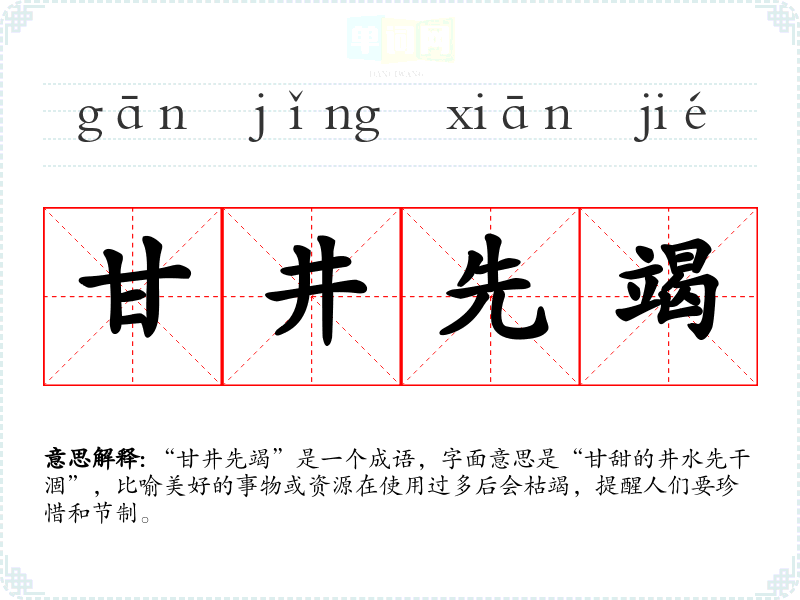“甘井先竭”是一个成语,字面意思是“甘甜的井水先干涸”,比喻美好的事物或资源在使用过多后会枯竭,提醒人们要珍惜和节制。