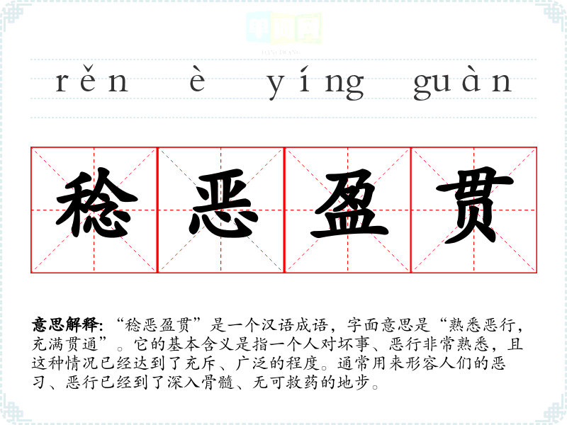 “稔恶盈贯”的来源并不十分明确,但其构成的字词均有深厚的文化底蕴。“稔”字常用来形容对事物的熟悉,尤其是负面的事情;“恶”则指代坏事或不良行为;“盈贯”则意味着充满、贯通之意。成语的形成可能与古代对道德败坏的批判相关,反映了古人对社会风气的忧虑。