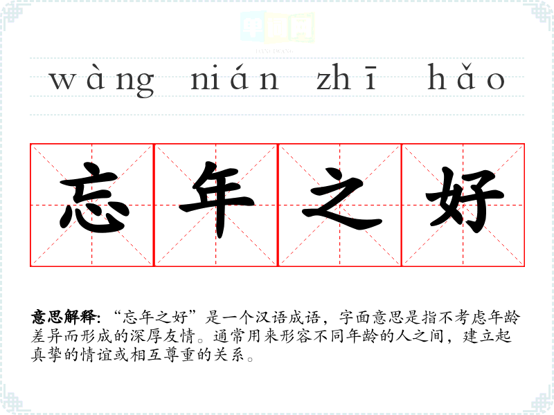 “忘年之好”是一个汉语成语,字面意思是指不考虑年龄差异而形成的深厚友情。通常用来形容不同年龄的人之间,建立起真挚的情谊或相互尊重的关系。