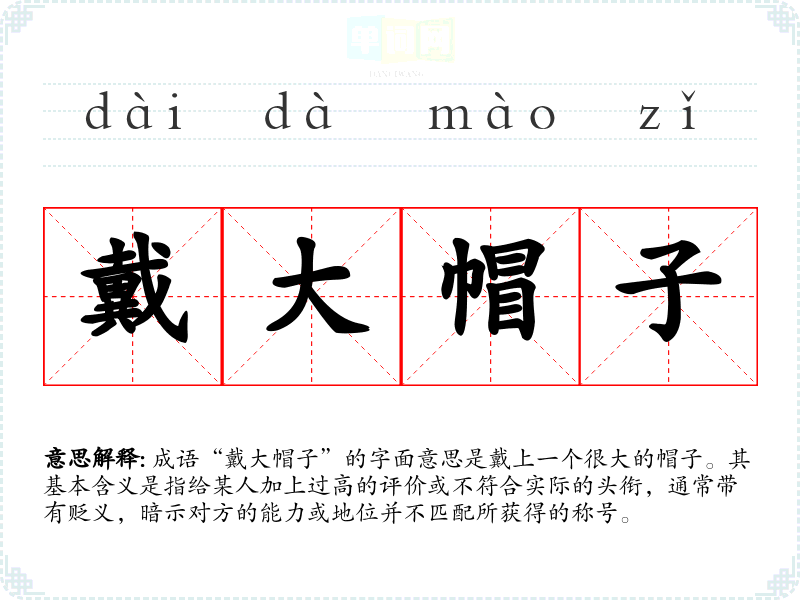成语“戴大帽子”的字面意思是戴上一个很大的帽子。其基本含义是指给某人加上过高的评价或不符合实际的头衔,通常带有贬义,暗示对方的能力或地位并不匹配所获得的称号。